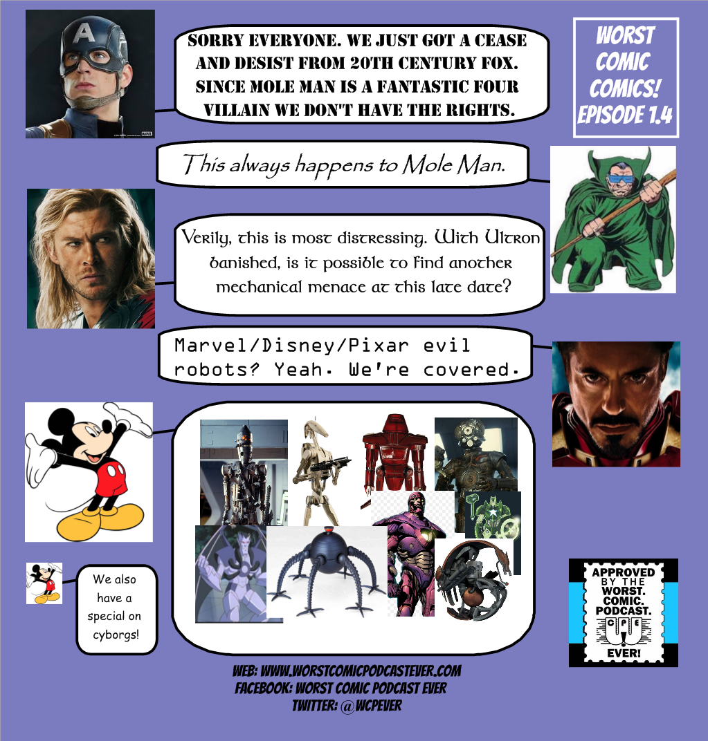 Worst Comic Comics Episode 1.4 By comicconjohn: on January 9, 2015 • ( 0 ) Share this: Click to share on X (Opens in new window) X Click to share on Facebook (Opens in new window) Facebook Like Loading...‹ WCPE Episode 026 – For January 7, 2015Worst Comic Comics Episode 1.5: Beef Cake Part 1 (of 2) ›Categories: JohnTags: Avengers 2, Captain America, Disney, Thor, Worst Comic Comics Related Articles WCPEver Episode 262 – Art of DC Comics Panel WCPE Interview – Jeffrey Edwards WCPE Interview – Author Carole Barrowman Mind MGMT in Review with Omaha Bound