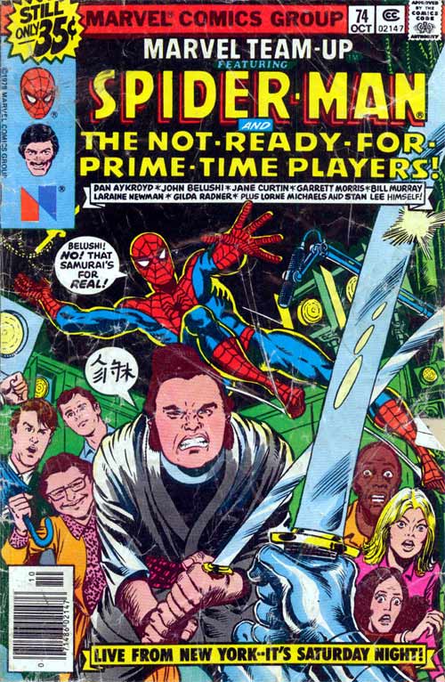 But one moment got overlooked – the time that Stan Lee hosted Saturday Night Live in 1978. You remember that classic episode, right? Rick Jones was the musical guest. Garrett Morris dressed up as Thor, and Laraine Newman donned a Ms. Marvel costume. Sitting in the balcony was Daily Bugle photographer Peter Parker and his date, Mary Jane Watson. (And if you look closely in that balcony, you will also find a cameo by Waldorf & Statler, who are taking a break from The Muppet Show.) All of this was detailed in Marvel Team-Up #74, my pick for Throwback Thursday this week.