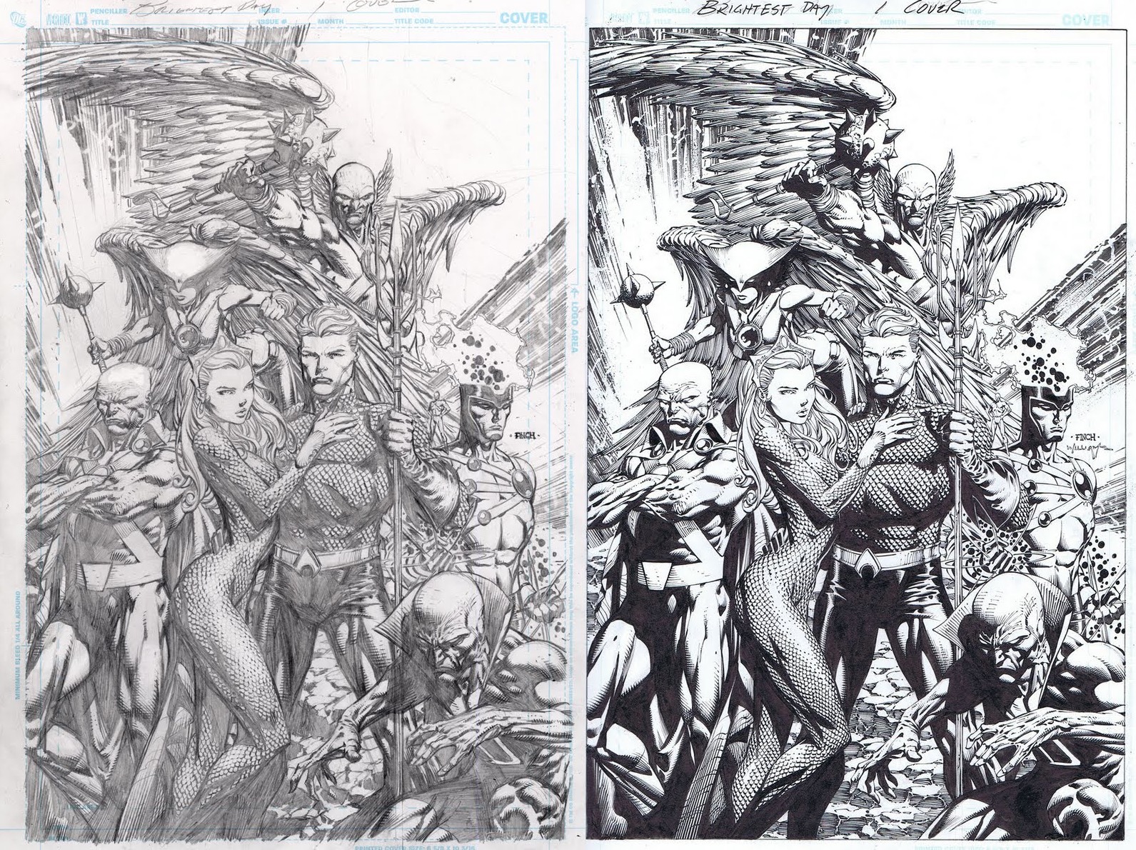Here are some examples of his awesome work. The fist is a JLA cover drawn by David Finch, the second is his style over Neal Adams pencils, and the final image is of jim Lee’s cover to Justice League #4.