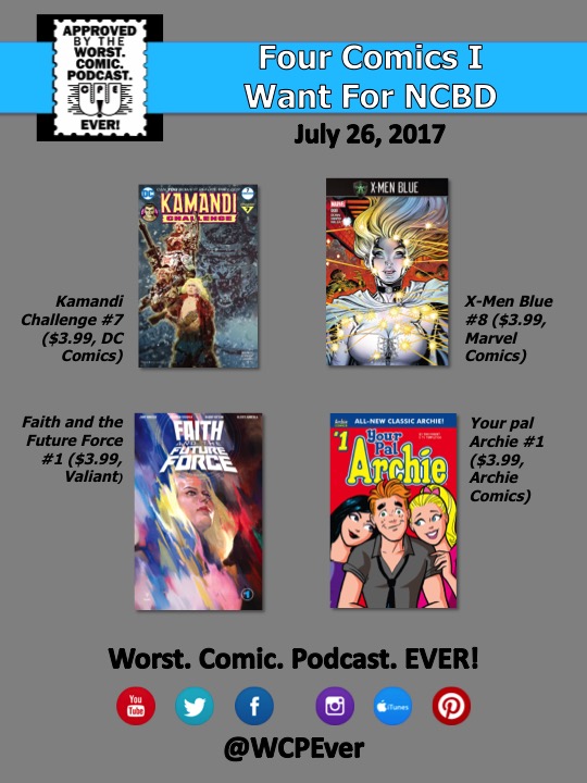 Four Comics I Want for NCBD: July 26, 2017 By jerrymcmullen on July 26, 2017 • ( 0 ) I love the smell of new comics on a Wednesday! #WhatsInYourTote Share this: Click to share on X (Opens in new window) X Click to share on Facebook (Opens in new window) Facebook Like Loading...‹ WCPE Episode 162 – Creator Interviews Summer 2017Throwback Thursday – Showcase Presents Legion of Super-Heroes Vol. 2 ›Categories: Four Comics I Want for NCBDTags: Archie Comics, DC Comics, Faith and the Future Force, Kamandi Challenge, Marvel Comics, Valiant, X-Men Blue, Your Pal Archie Related Articles Four Comics I Want for NCBD – October 18, 2017 Four Comics I Want for NCBD – October 4, 2017 Four Comics I Want for NCBD: September 6, 2017 Four Comics I Want for NCBD: August 23, 2017